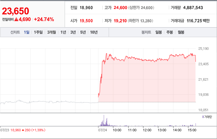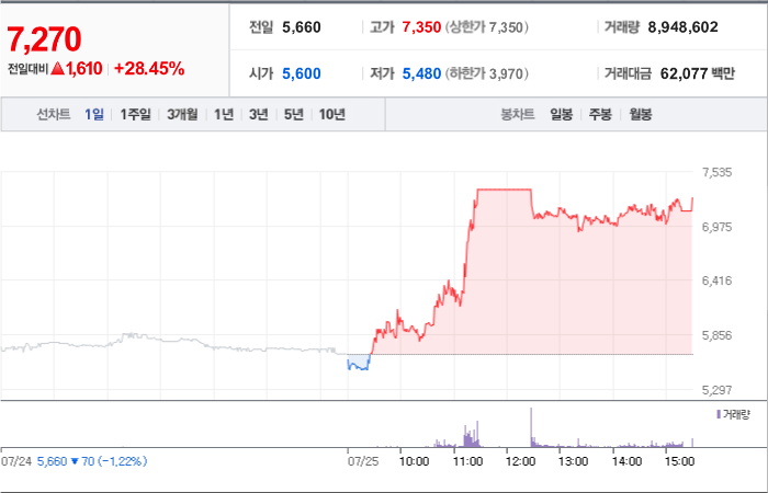 625시총: 1,236억원, 거래량:6,861,939, 거래대금:23,229백만