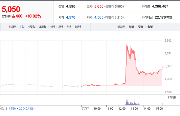 5,000시총: 2,677억원, 거래량:8,212,476, 거래대금:272,866백만