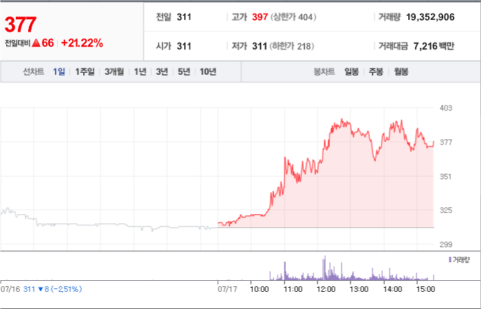 385시총: 405억원, 거래량:1,577,239, 거래대금:4,161백만