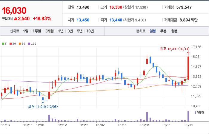 현재가: 16,030, 어제대비:+2,540