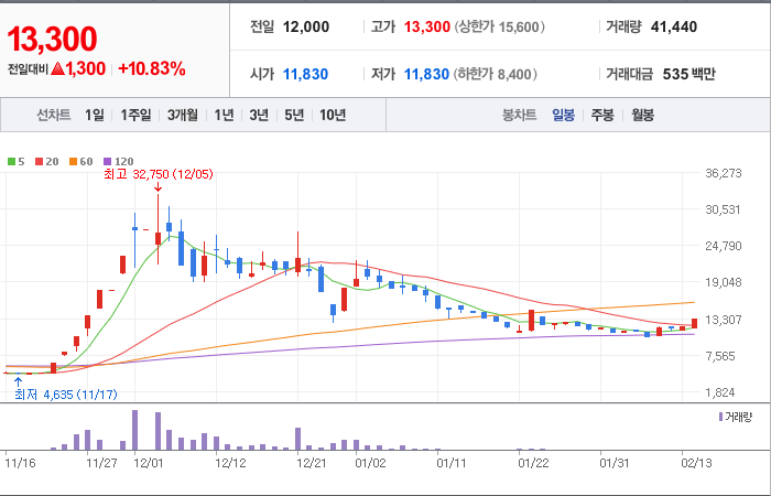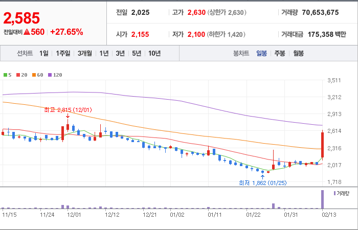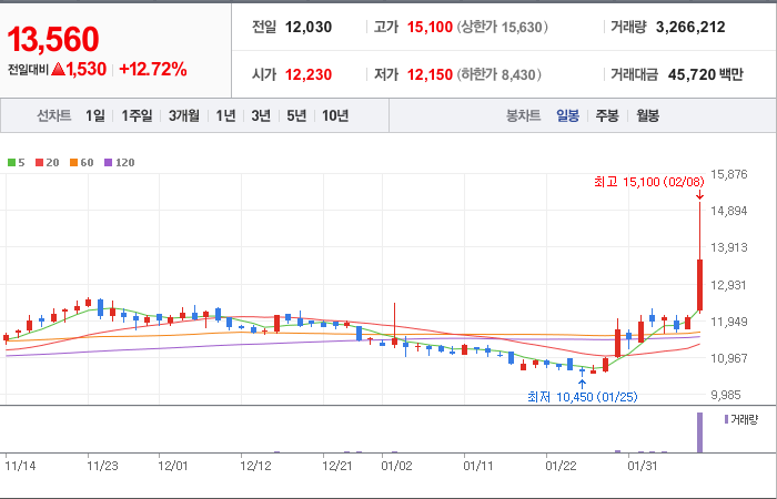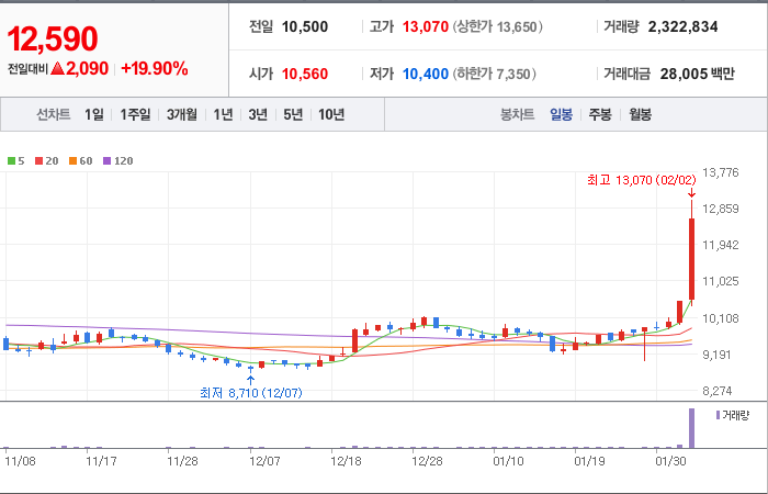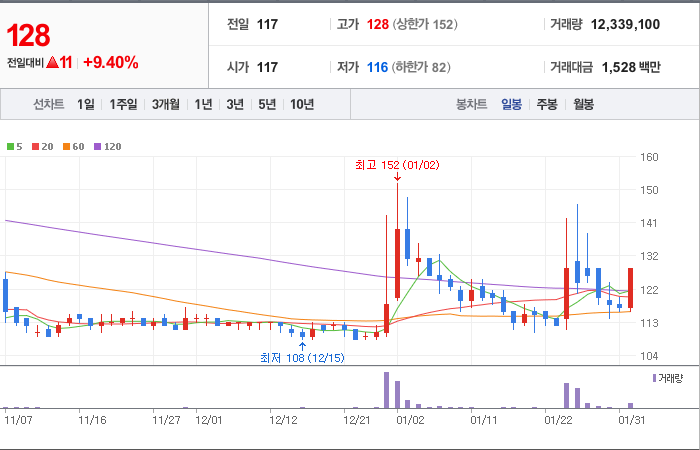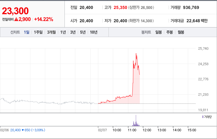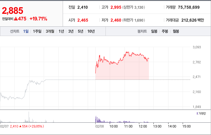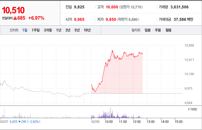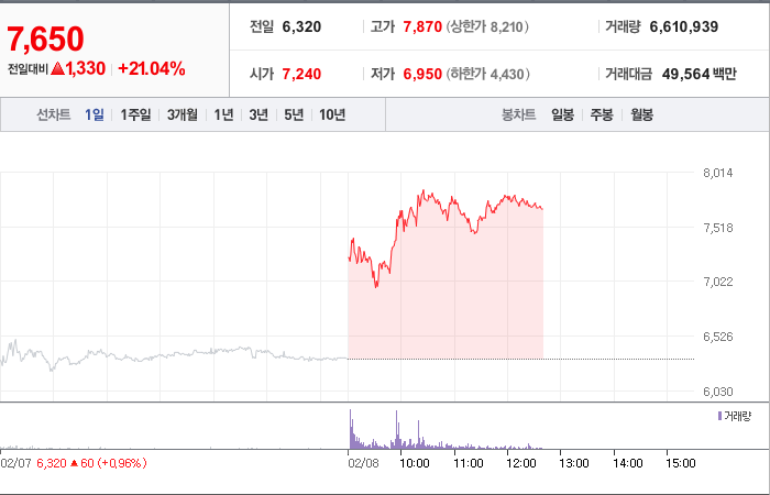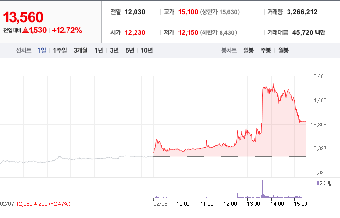 시총: 1,276억원, 거래량:12,871,511, 거래대금:94,263백만