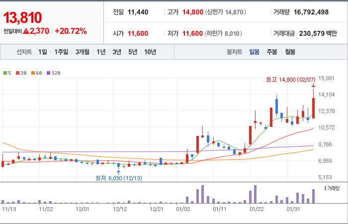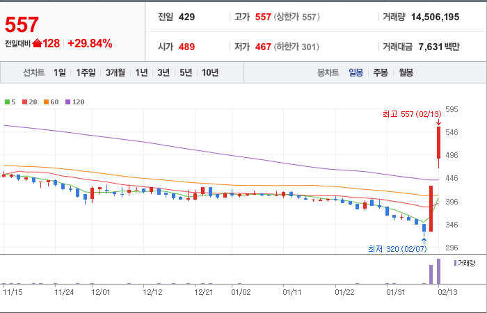 시총: 1,463억원, 거래량:15,137,390, 거래대금:130,654백만