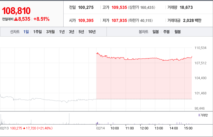 현재가: 108,810, 어제대비:+8,535