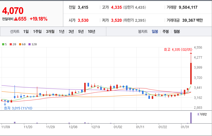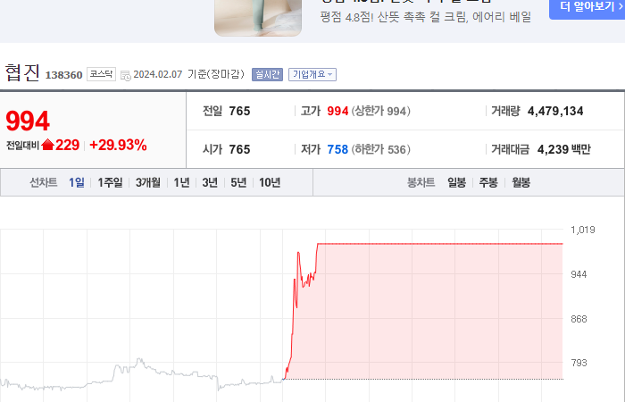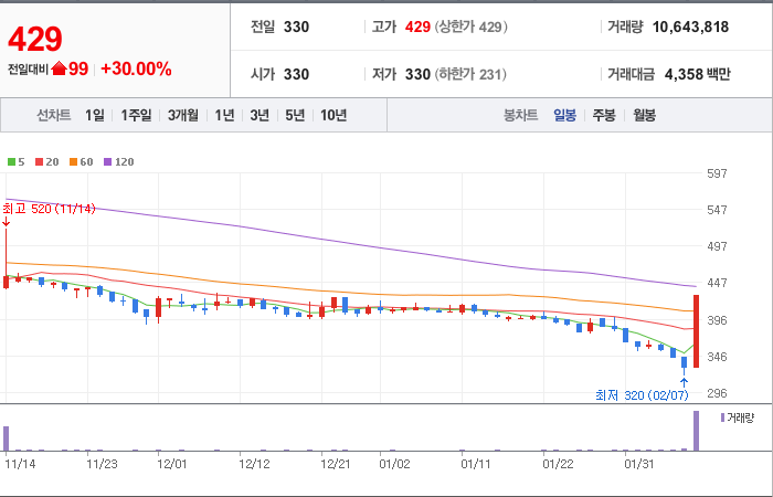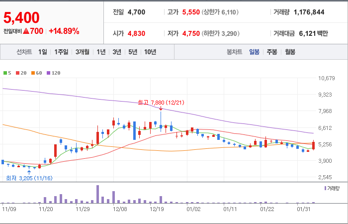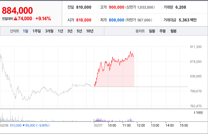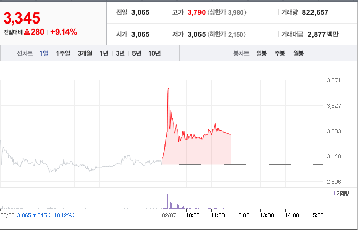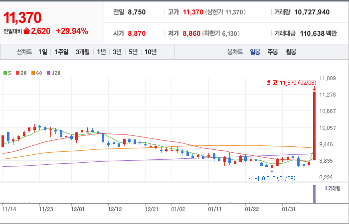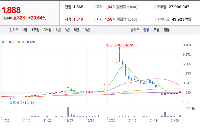 시총: 926억원, 거래량:5,292,548, 거래대금:41,880백만