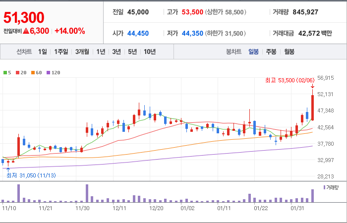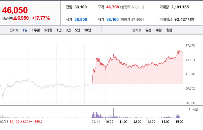 현재가: 46,050, 어제대비:+6,950