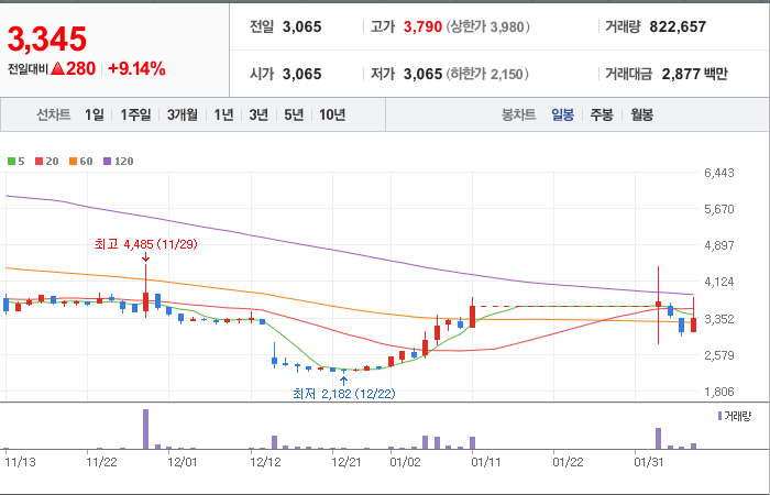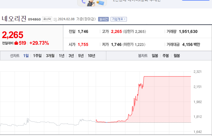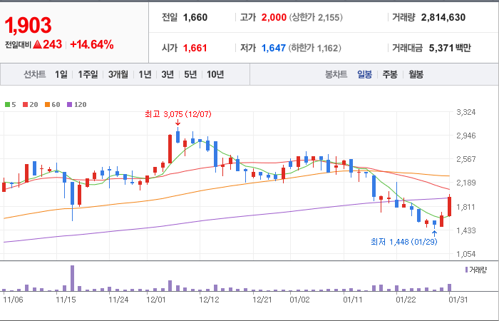 시총: 1,446억원, 거래량:966,309, 거래대금:11,997백만