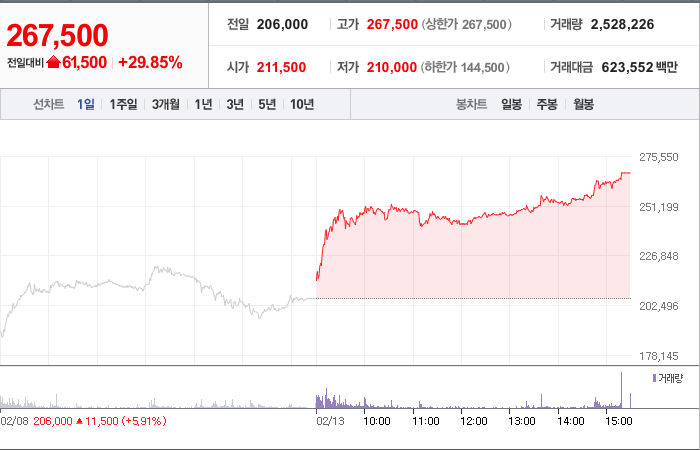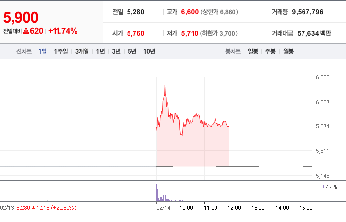 시총: 6,231억원, 거래량:27,282,199, 거래대금:359,485백만