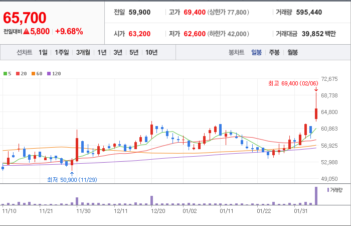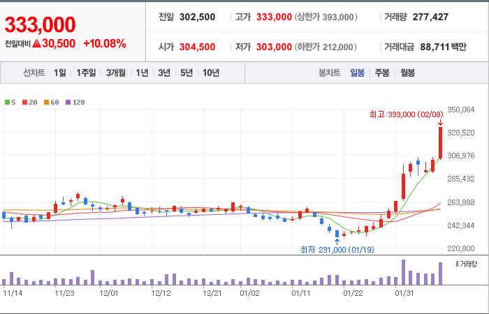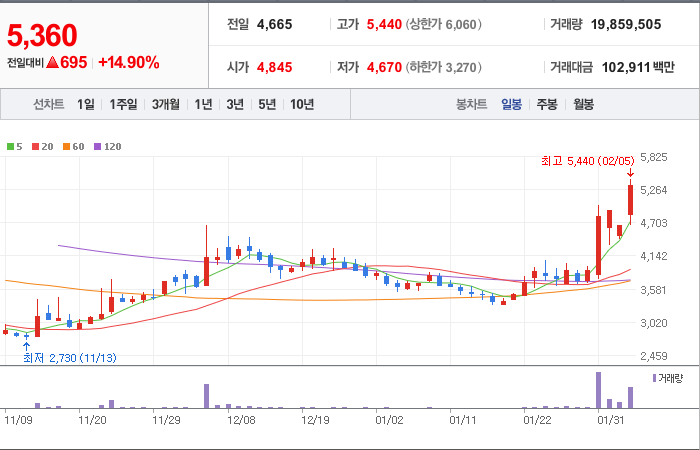 시총: 5,275억원, 거래량:2,101,155, 거래대금:92,427백만