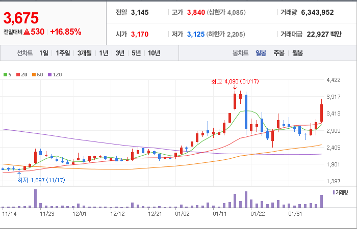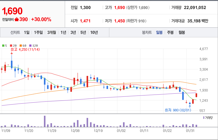 시총: 689억원, 거래량:5,662,911, 거래대금:8,021백만