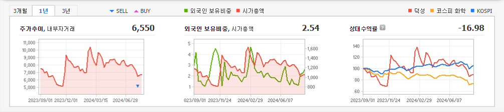 -기업 개요 및 평가- -[2024/06/18] 판관비 감소로 영업이익 증가 동사 사업은 합성피혁 부문, 합성수지 부문, 재료사업 부문으로 분류되며 합성피혁 부문은 스포츠용품과 가구, 자동차 내장재 등을 만드는 데 쓰이는 합성피혁을 만들어 판매함. 합성수지 부문은 합성피혁 주원료를, 재료 사업 부문은 전자재료 등을 생산함. 국내업체는 동사를 비롯하여 (주)백산, 대원화성(주), (주)정산인터내셔널 등 약 30여개의 업체가 동업계를 형성하고 있음. 2024년 3월 전년동기 대비 연결기준 매출액은 4.8% 증가, 영업이익은 13.3% 증가, 당기순이익은 26.1% 감소. 내수는 6.3% 감소하였지만 DUKSUNG(G.Z)에서 생산하는 상품의 수출이 43.4% 증가하는 등 전체 수출이 13.5% 증가함에 따라 매출 증가함. 올해 경영전망도 불확실한 부분이 많지만 기존 사업의 토대 위에 새로운 제품의 개발에 주력하여 수익성 증대에 힘쓸 예정임.