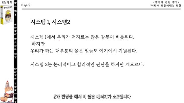 책의 핵심 메시지는 시스템 1의 오류를 피하기 위해 한 번 더 생각해보는 것이 중요하다는 것이다.