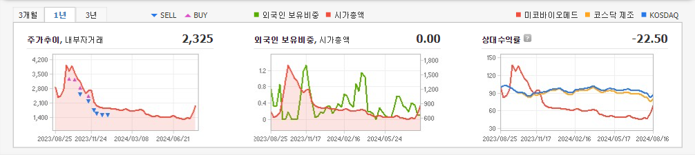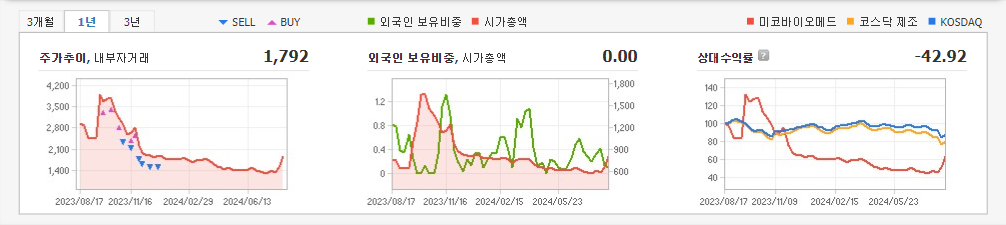-종목 관련 뉴스- 2024.08.19 17:20 / 미코바이오메드, 젬텍 외 5인에 경영권 매각-블로터 / https://n.news.naver.com/mnews/article/293/0000057619 2024.08.19 17:10 / 미코바이오메드, 165억원 규모 최대주주 변경 수반 주식양수도 계약-이데일리 / https://n.news.naver.com/mnews/article/018/0005814987 2024.04.30 10:35 / 미코바이오메드, 다음달 2일 기업설명회 개최-뉴시스 / https://n.news.naver.com/mnews/article/003/0012520322-기업 개요 및 평가- -[2024/06/04] 독보적인 면역진단 플랫폼 기술 2020년 코넥스에서 코스닥으로 이전상장하였고 랩칩(Labchip) 기술을 바탕으로 현장진단 (POCT)에 최적화된 토탈 솔루션을 제공하는 체외진단 전문기업임. 동사는 2021년 2월 브라질 파트너와 합작법인을 설립하고, 감염성 질환, 열대병 질환, 식중독등 진단 키트, 장비, LabChip의 생산 및 판매중임. 항원-항체 결합을 기반으로 하는 면역측정법인 ELISA 문제점을 개선한 기술을 보유하 2024년 3월 전년동기 대비 연결기준 매출액은 62.4% 증가, 영업손실은 89.1% 증가, 당기순손실은 21.8% 증가. 인도 빈혈 진단 솔루션 제공을 통한 모자보건 역량 강화 사업이 한국국제협력단(KOICA)로부터 포용적 비즈니스프로그램(IBS)으로 선정돼 현지 사업화 기대감이 높아짐. 동사는 국제 보건협력기구에 원숭이두창 바이러스 진단키트를 공급해 아프리카 지역을 공략할 계획을 가지고 있어 매출 성장이 기대됨.