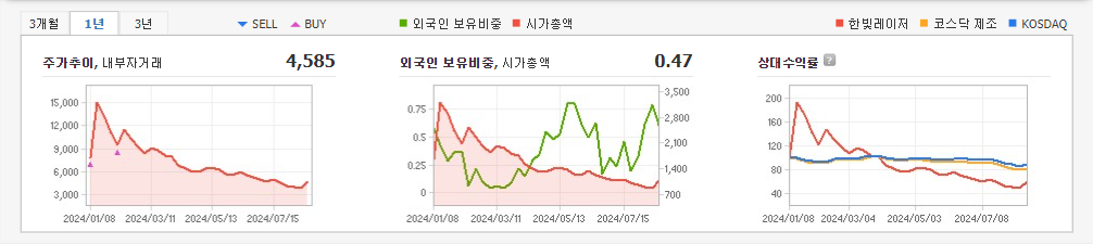 -종목 관련 뉴스- 2024.08.12 13:49 / [특징주] 한빛레이저, 전기차 '배터리 정보' 공개 소식에 셀 추적 이...-머니S / https://n.news.naver.com/mnews/article/417/0001020404 2024.03.11 09:18 / [종목이슈] 한빛레이저, 삼성 등 24조 2차전지 투자 수혜 기대↑-아이뉴스24 / https://n.news.naver.com/mnews/article/031/0000819082 2024.02.27 08:34 / 김정묵 한빛레이저 대표 "상장 후 97% 상승… 시장 기대 부응하겠다"-머니S / https://n.news.naver.com/mnews/article/417/0000984669-기업 개요 및 평가- -[2024/06/11] 신규 수주 증가로 실적 회복 산업용 레이저 제조 생산을 목적으로 설립되었으며, 이차전지 제조 장비와 자동차 제조 장비를 주력으로 고객 사양에 부합하는 레이저 웰딩 장비, 레이저 커팅 장비 등을 제조 및 공급함. 레이저 기술을 적용한 주요 제품은 ① 이차전지 레이저 제조 장비, ② 자동차(전기차 포함) 레이저 제조 장비, ③ 기타(반도체/전자기기) 레이저 제조 장비로 구분할 수 있음. 이차전지 및 전기차용 레이저 제조 장비 비중을 지속적으로 확대해 가고 있음. 2024년 3월 전년동기 대비 연결기준 매출액은 181.3% 증가, 영업손실은 61.9% 감소, 당기순이익 흑자전환. 기술력을 바탕으로 자동차 제조장비의 신규 수주 증가 및 일회성 비용 해소로 실적 회복하였음. VIN Marker는 완성차 업체 생산라인 차체공정 중에 레이저를 이용해 차량의 고유번호를 마킹하는 제품으로 F사와 공동으로 개발하여 전세계 F사 생산라인에 적용 완료함.