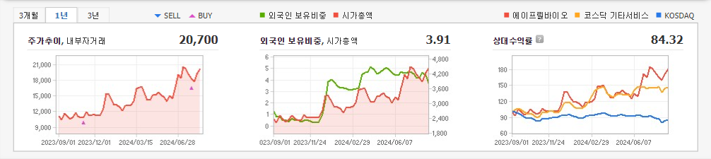 -종목 관련 뉴스- 2024.08.26 07:55 / 에이프릴바이오가 기술이전한 물질, 40조 시장 진출 확정-이데일리 / https://n.news.naver.com/mnews/article/018/0005819936 2024.08.16 08:45 / 에이프릴바이오 "기술력 성과 이제 시작…기업가치 추가 상승 자신"-머니투데이 / https://n.news.naver.com/mnews/article/008/0005077607 2024.08.12 15:01 / 에이프릴바이오, 상장 2년 만에 영업흑자 달성-한국경제 / https://n.news.naver.com/mnews/article/015/0005020734-기업 개요 및 평가- -[2024/06/03] 바이오마커를 통한 효능 간접비교 시작 동사는 교원 창업 형태로 설립된 신약 후보물질 연구 및 개발을 영위하고 있으며, 2013년 1월 30일 설립됨. 당사는 신약 후보물질을 개발하는 연구개발 전문기업으로, 신약 후보물질을 임상1상전후로 기술이전하여 기술료를 통해 수익을 창출하는 사업을 영위하고 있음. 원하는 타겟 항원 결합 능력을 지닌 신약 후보물질을 획득하는 '항체라이브러리' 기술과 약효단백질의 혈청 내 반감기를 증대시키는 'SAFA플랫폼' 기술을 보유 중. 2024년 3월 전년동기 대비 별도기준, 영업손실은 25.8% 감소, 당기순손실은 19.1% 감소. 동사는 올해 2분기 CSR report를 도출할 것으로 전망되며 해당 결과를 통해 Sanofi의 Frexalimab, UCB의 Dapirolizumab pegol의 효능을 간접 비교할 수 있을 것으로 전망됨. 룬드벡은 과도한 연구개발비용 상승을 억제하기 위해서 보다 효율적인 전략이 필요할 것으로 예상됨.